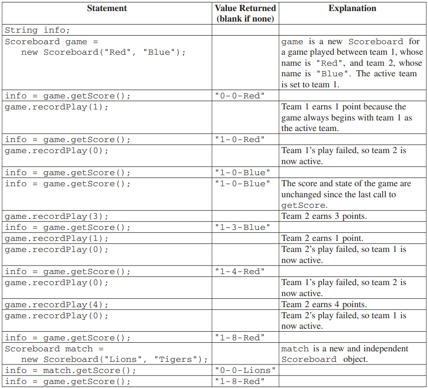 Scoreboard class. Your implementation must meet all specifications and conform to the examples shown in the preceding table.