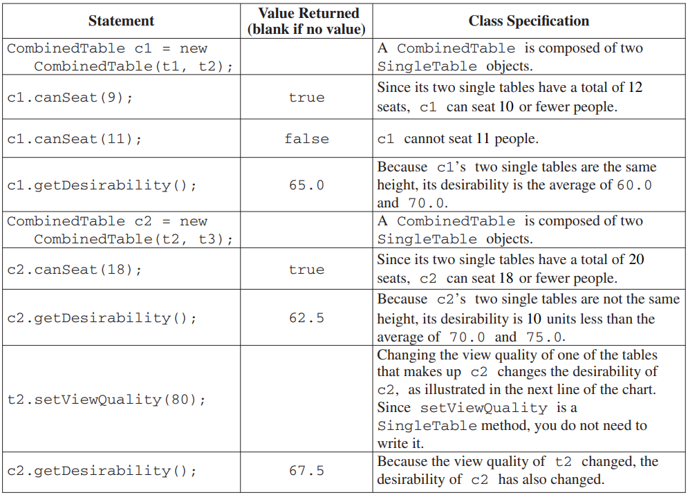 At the restaurant, customers can sit at tables that are composed of two single tables pushed together. You will write a class CombinedTable to represent the result of combining two SingleTable objects, based on the following rules and the examples in the chart that follows.