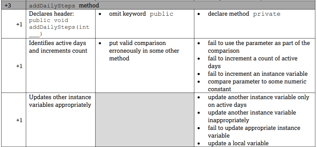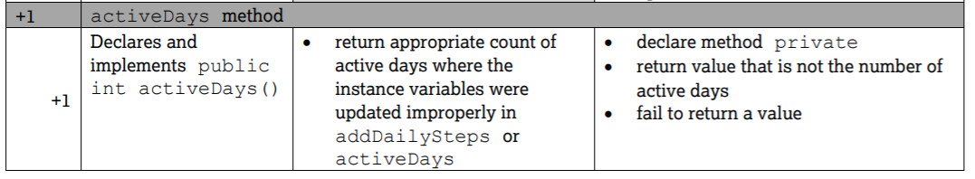 Here is the rubric for the accessor method activeDays for this problem. The second column is small mistakes that will still earn the point but the third column is larger mistakes that will not earn the point. Did you receive the point for this method? In class, your teacher may have you grade each othersβ code.