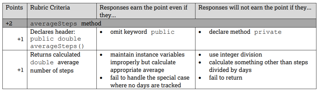 Here is the rubric for the averageSteps method for this problem. Did you receive all the points? In class, your teacher may have you grade each othersβ code.