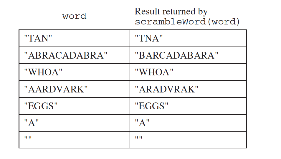 Question 1. This question involves reasoning about strings made up of uppercase letters. You will implement two related methods that appear in the same class (not shown). The first method takes a single string parameter and returns a scrambled version of that string. The second method takes a list of strings and modifies the list by scrambling each entry in the list. Any entry that cannot be scrambled is removed from the list.
