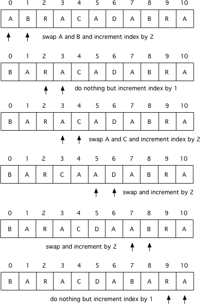 In this example we are looping through the characters from left to right one at a time and comparing the two adjacent characters. If the first is an βAβ and the second is not we will swap the characters and then need to increment the index to not check the ones we swapped again. So we start checking the characters at index 0 and 1 and then swap them, but then move to comparing 2 and 3 rather than 1 and 2 which means we increment the current index by 2. If we donβt swap the characters we only increment the index by 1.