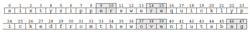 is encoded as the list of string parts [ (37, 3), (14, 2), (46, 2), (9, 2) ] denoting the substrings "ove"