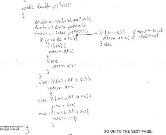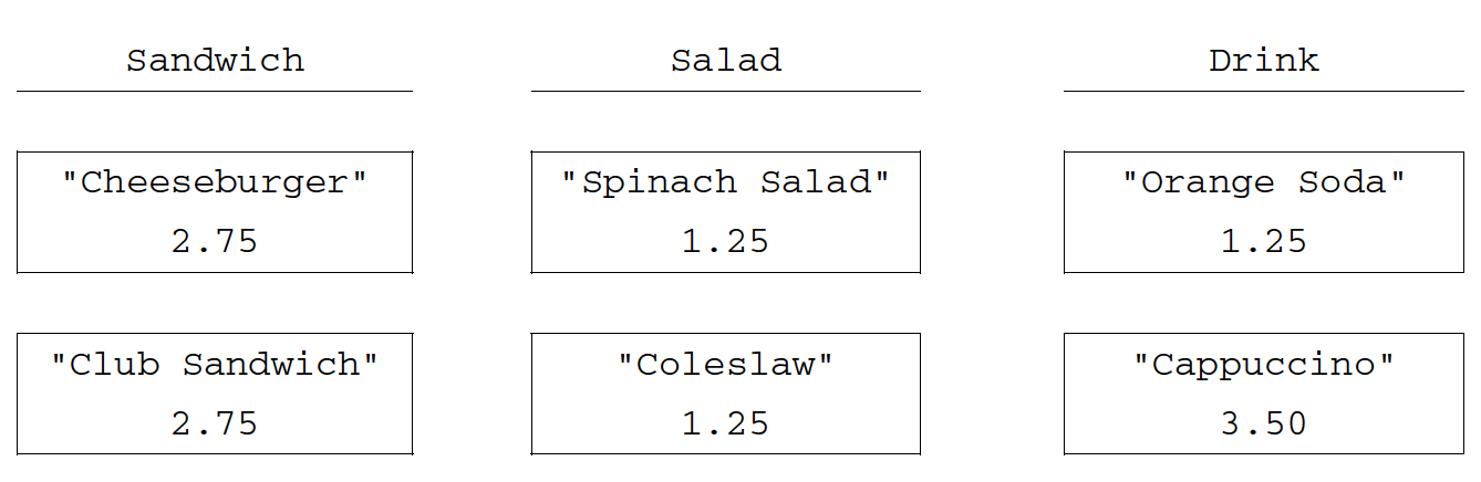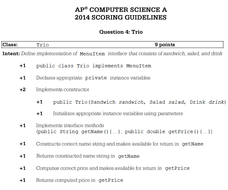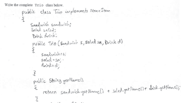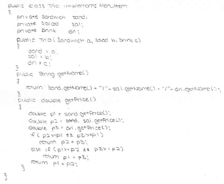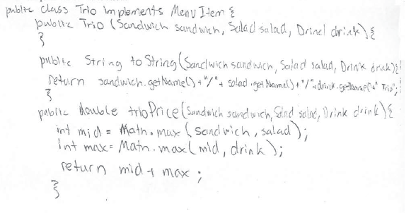 Question 4. The menu at a lunch counter includes a variety of sandwiches, salads, and drinks. The menu also allows a customer to create a βtrio,β which consists of three menu items: a sandwich, a salad, and a drink. The price of the trio is the sum of the two highest-priced menu items in the trio; one item with the lowest price is free. Each menu item has a name and a price. The four types of menu items are represented by the four classes Sandwich, Salad, Drink, and Trio. All four classes implement the following MenuItem interface.