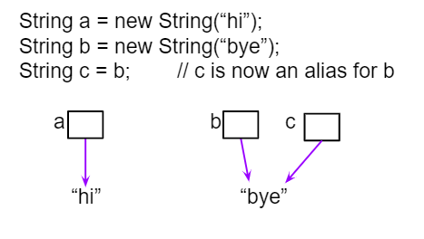 is used to compare object variables, it returns true when the two variables refer to the same object. These variables are called object references and aliases for the same object. With strings this happens when one string variable is set to another.