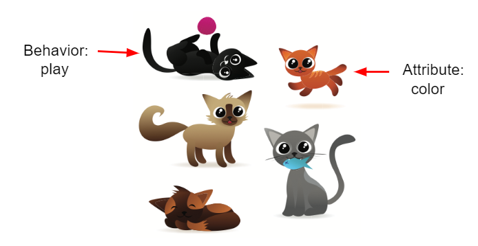The following picture has lots of cats (objects of the type cat). They are all different, but they share the same attributes and behaviors that make up a cat. They are all instances of cat with different values for their attributes. Name some of the attributes and behaviors of the cats below. For example, the color ( attribute) of the first cat is black ( attribute value) and it is playing ( behavior).