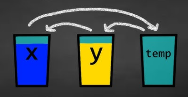 To see why, imagine that we have a glass of water and a glass of orange juice and we want to swap the contents of the two glasses without making a huge mess? We would need a third glass to temporarily hold the contents of one of the glasses, letβs say the glass of water. Once the water glass is empty we can pour the contents of the glass of orange juice into it. Then we can pour the water from the third glass into the now empty orange juice glass and the contents have been swapped. (At the point we can put the third glass in the dishwasher.) This is the same idea behind swapping elements in an array.