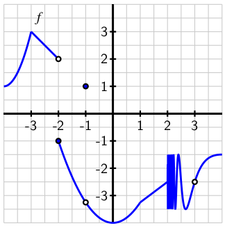 The function \(f\) given in the figure in Preview Activity 1.7.1 fails to have a limit at only two values: at \(a = -2\) (where the left- and right-hand limits are 2 and \(-1\text{,}\) respectively) and at \(x = 2\text{,}\) where \(\lim_{x \to 2^+} f(x)\) does not exist. Note well that even at values such as \(a = -1\) and \(a = 0\) where there are holes in the graph, the limit still exists.