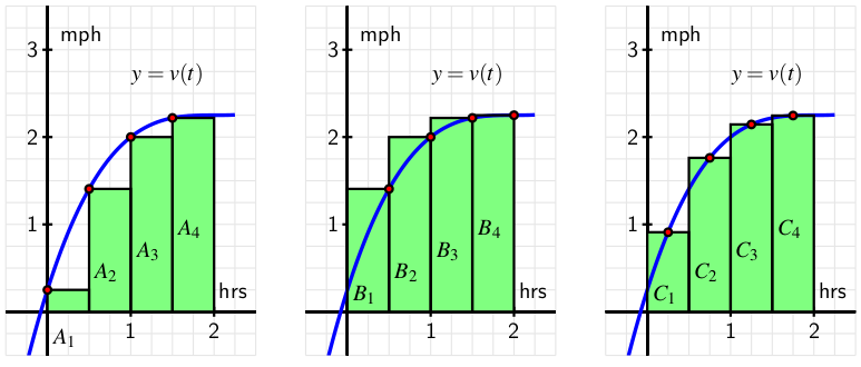 Note that in each diagram, we use four rectangles to estimate the area under \(y = v(t)\) on the interval \([0, 2]\text{,}\) but the method by which the four rectangles’ respective heights are decided varies among the three individual graphs.