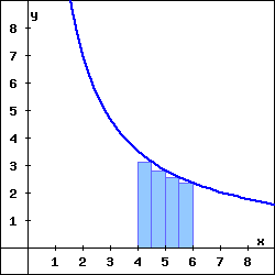 (b) The rectangles in the graph above illustrate a right endpoint Riemann sum for \(f(x)\) on the interval \(4 \leq x \leq 6\text{.}\) The value of this right endpoint Riemann sum is , and it is an