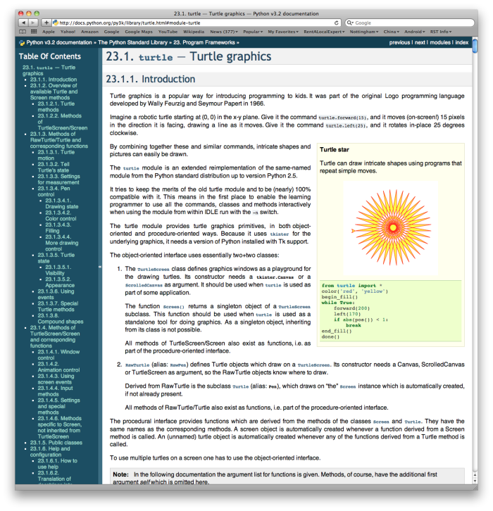 But what if no one had told us about turtle? How would we know that it exists. How would we know what it can do for us? The answer is to ask for help and the best place to get help about the Python programming environment is to consult with the Python Documentation.