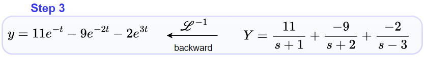 Recall that the first step of the Laplace Transform Method involves a forward transformation, which converts the \(y(t)\)-equation into an equation containing \(Y(S)\) and \(s\text{.}\) Now, we skip ahead to the final step of the method, where we reverse this process to return to the \(y(t)\)-equation, revealing the solution to the original differential equation.