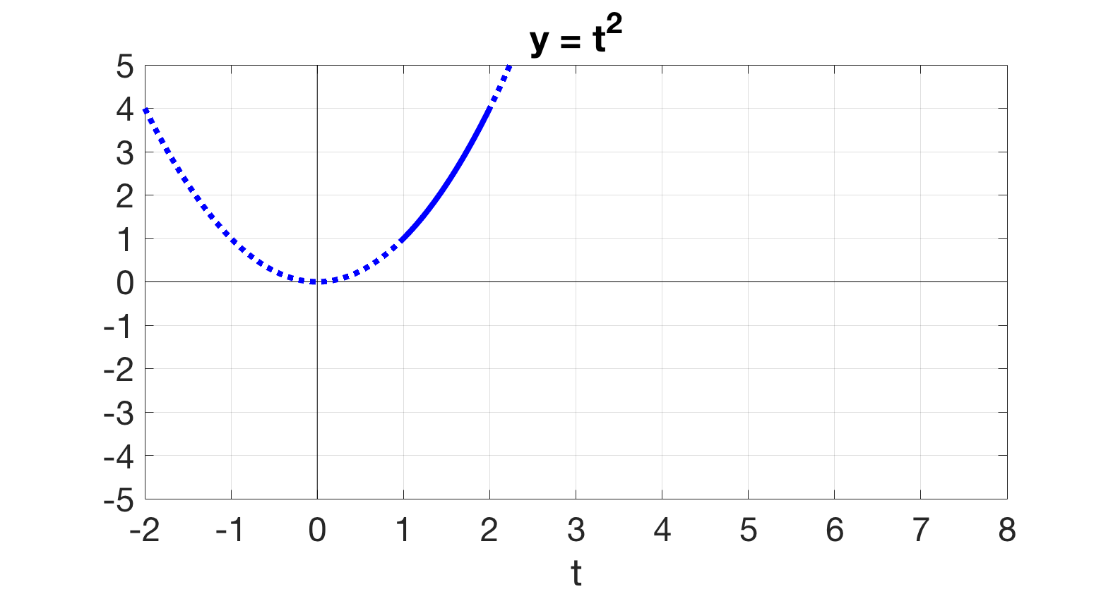 If we want to graph, we also use those restrictions. When \(t \lt 1\text{,}\) or equivalently when \(t\) is in the interval \((-\infty, 1),\) we know that the graph of \(g\) will look like the horizontal line \(y=0\text{;}\) on the interval \([1, 2),\) the graph will look like the graph of the parabola \(y = t^2\text{;}\) etc.