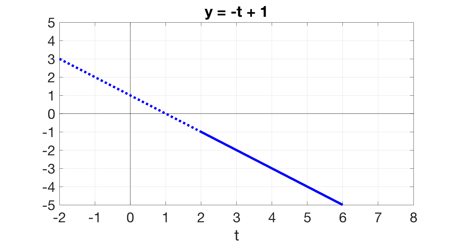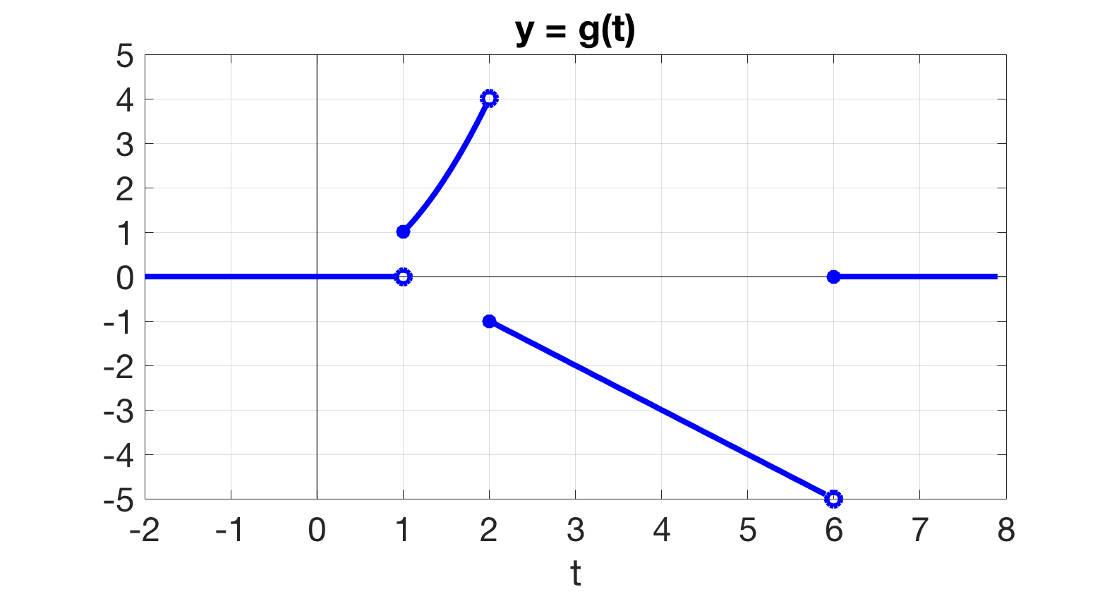 If we want to evaluate the function at a particular \(t\)-value, we use the restrictions on the right to point us to which piece of the function definition we should use. For example, if we want to know \(g(3)\text{,}\) then we look over at that right side and see that 3 falls into the interval \(2 \le t \lt 6,\) so we use the corresponding function, \(-t+1\text{.}\) Thus, \(g(3) = -3 + 1 = -2.\)