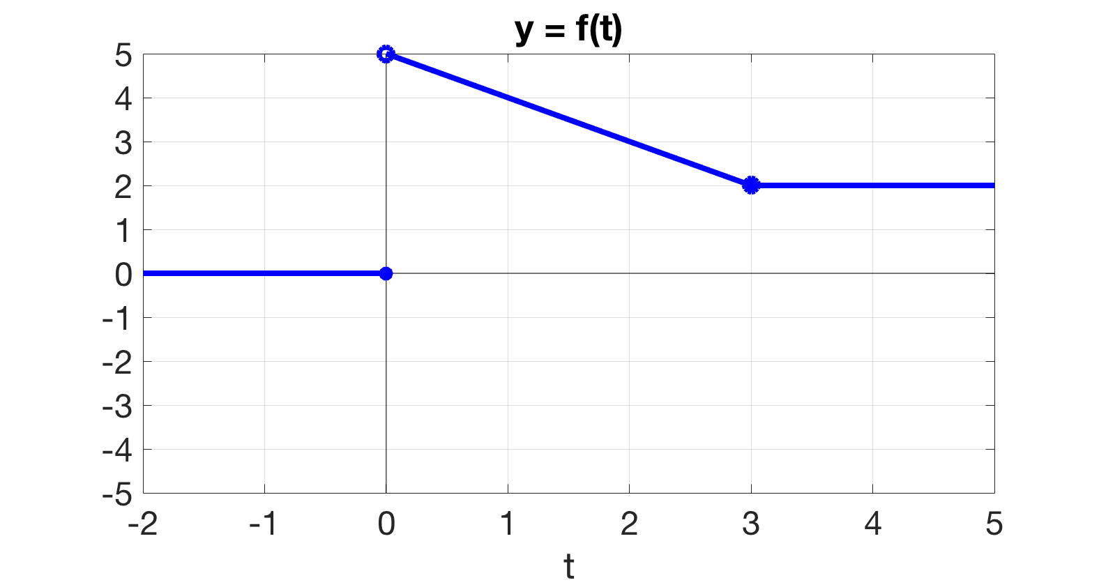 \(\displaystyle \ds f(t) = \left\{ \begin{array}{ll} 0, \amp t \lt 0 \\ 5-t, \amp 0 \le t \lt 3 \\ 2, \amp t \ge 3 \\ \end{array} \right.\)
