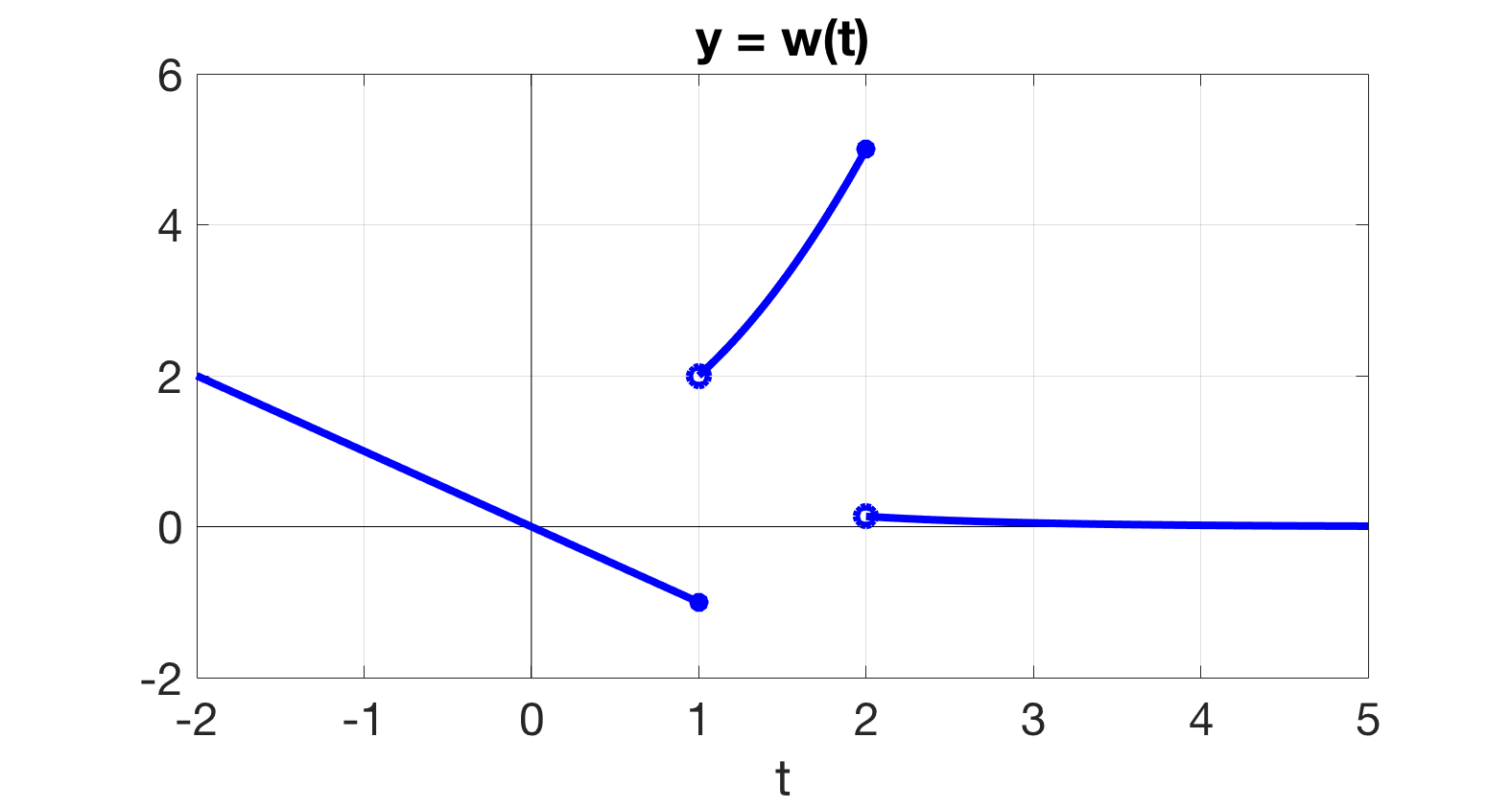 \(\displaystyle \ds w(t) = \left\{ \begin{array}{ll} -t, \amp t \lt 1 \\ t^2+1, \amp 1 \le t \lt 2 \\ e^{-t}, \amp t \ge 2 \\ \end{array} \right.\)