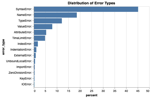 Nearly 90% of the error messages encountered are SyntaxError, TypeError, NameError, ValueError, or AttributeError. We will look at these errors in three stages: