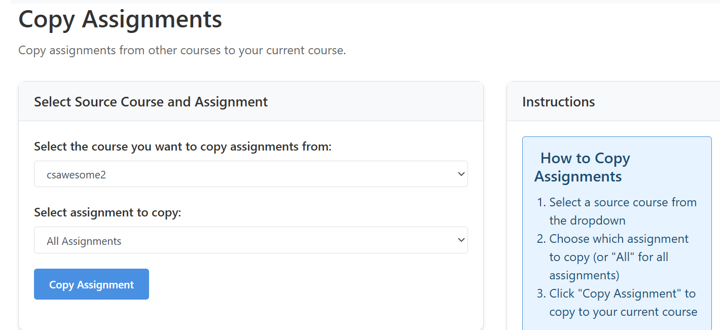 Once the course is selected you can copy one or all of the assignments to your course. If you do this multiple times courses with the same name will be ignored on the second copy. This makes it a little easier if you just want to keep one course in sync with another so you don’t have to remember and pick and choose.