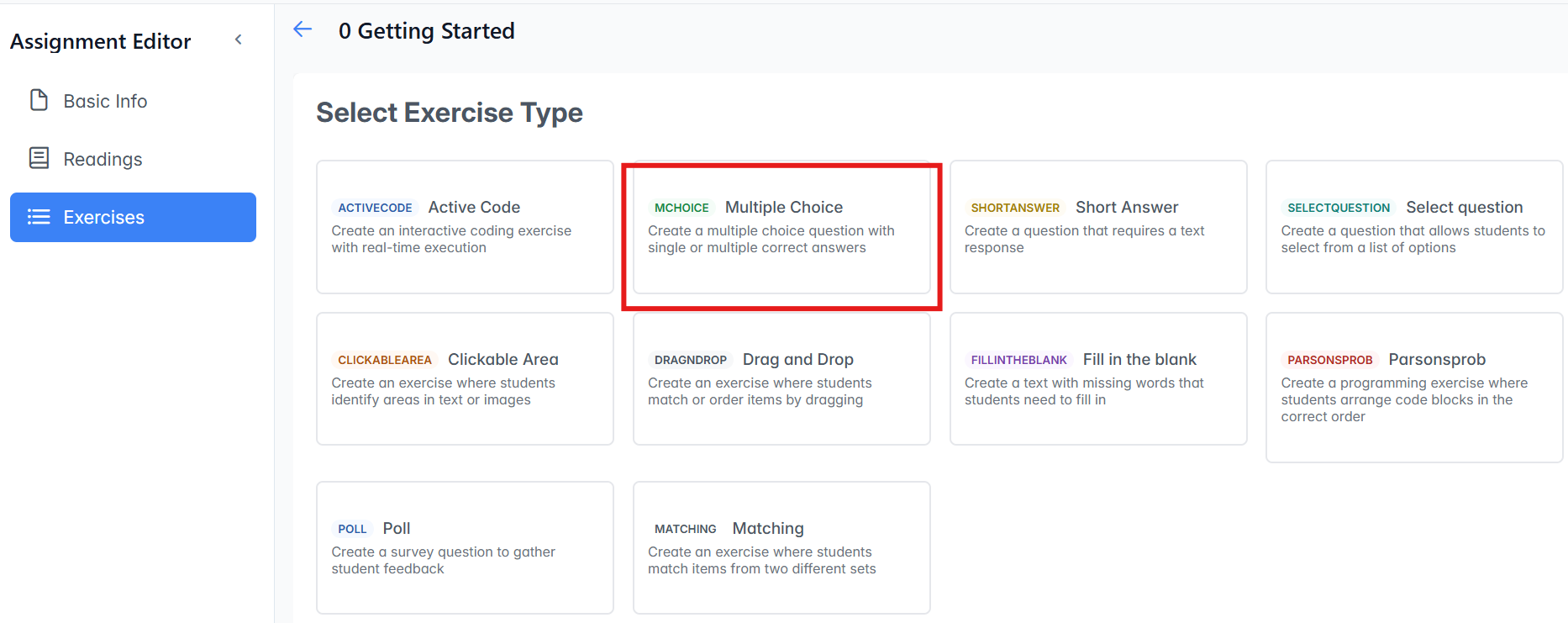 To create multiple choice questions, start or go to any assignment in the Instructor Dashboard "Assignment Builder". In the Exercises section of the assignment, click on "Add Exercise" and select "+ Create New Exercise" and then select "Multiple Choice".