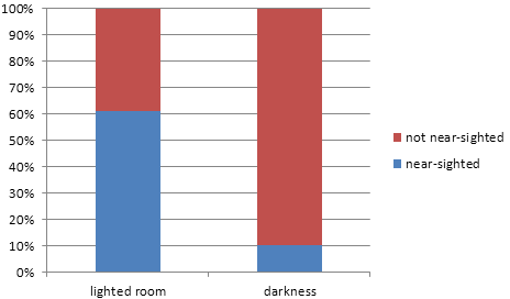 The segmented bar graph should show a much larger proportion of near-sighted children in the "some light" group compared to the "darkness" group. This difference appears very large and should be statistically significant.