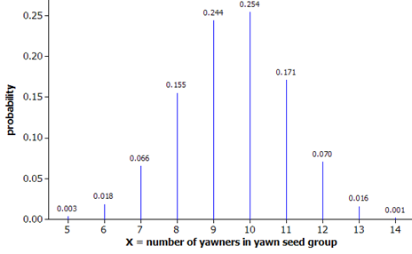 Interpretation: P(X β‰₯ 10), probability of 10 or more successes by random assignment alone (assuming no effect from the seed). If the yawn seed has no effect, the probability of finding 10 or more of 34 yawners in the seeded group when 50 subjects are randomly assigned to seeded and no-seed groups is 0.5128.