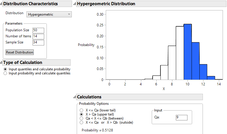 \(P(X β‰₯ 10)\) with \(M = 14\text{,}\) \(n = 34\text{,}\) \(N = 50\text{;}\) p-value = 0.5128