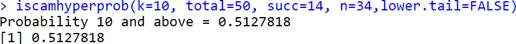 For example: iscamhyperprob(k=10, total=50, succ=14, n=34, lower.tail=FALSE)