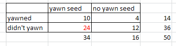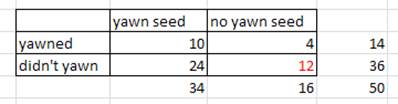 In the study they found that 10 of 34 subjects who had been given a yawn seed actually yawned themselves, compared with 4 of 16 subjects who had not been given a yawn seed.