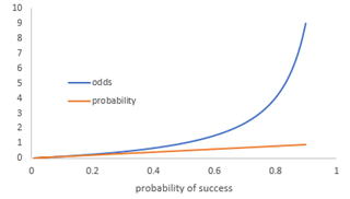 The graphs below show how (a) the probability of success and odds of success are related and (b) how relative risk and odds ratios are similar when the difference in proportions is small. Also note that when the difference in proportions is zero, the relative risk and the odds ratio are both one.