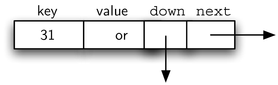 next and down, both of which are initialized to null. A data node consists of three references: the first two are for the key and value, and the third one is for another header node (which contains the references next and down). The diagrams above show a data node as containing the key, value, next, and down directly, but this nested structure is actually simpler. It means we can think of each row as a linked list of data nodes, and each column as a linked list of header nodes.