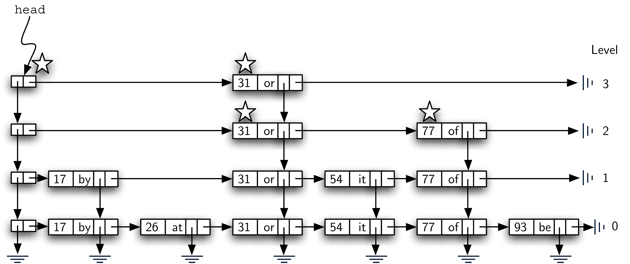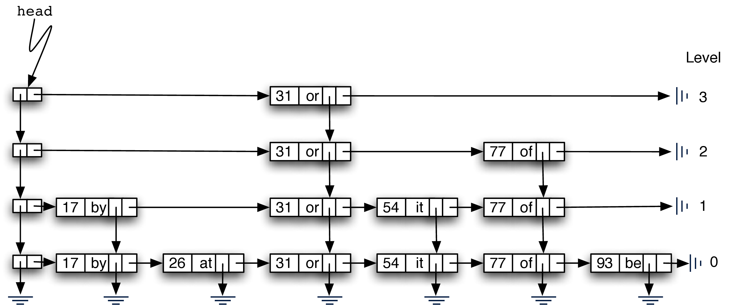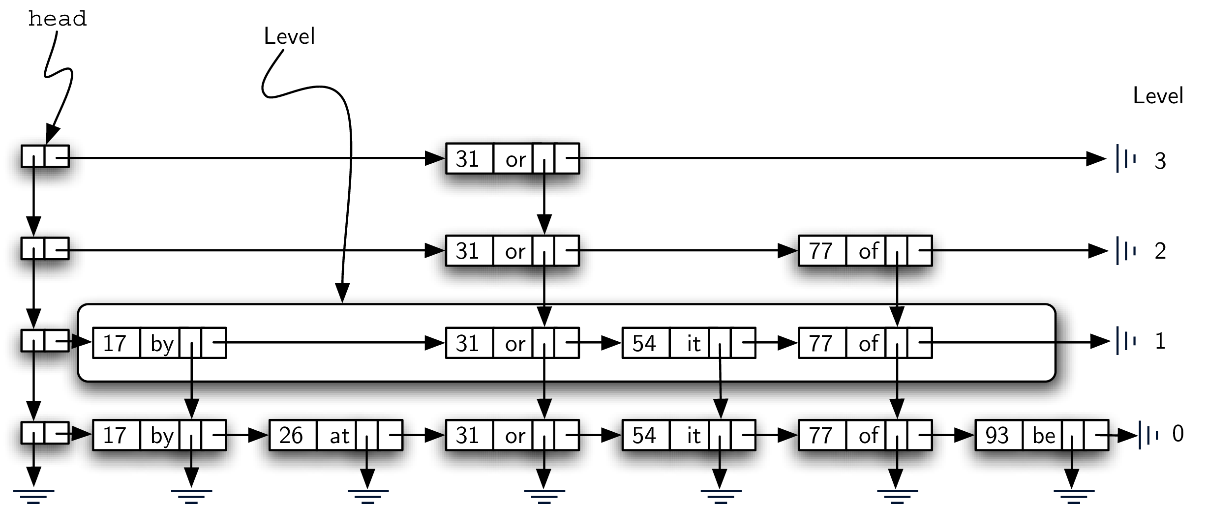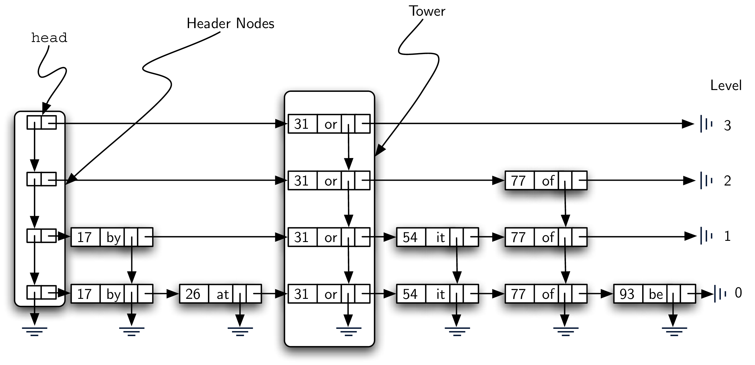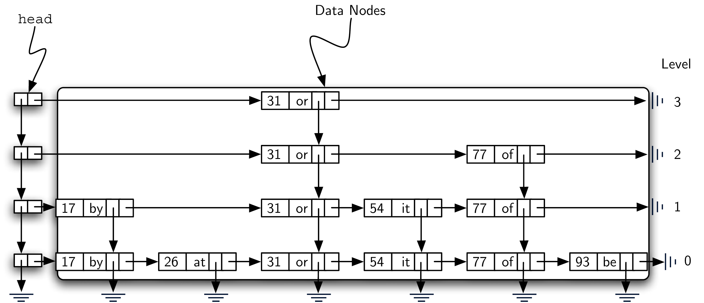null. As key-value pairs are added to the structure, the list head refers to the first header node which in turn provides access to a linked list of data nodes as well as access to lower levels.