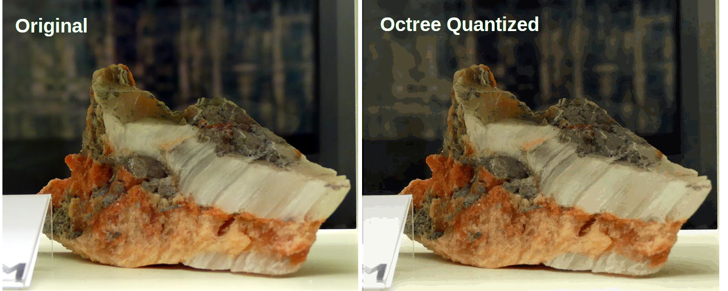 octree uses only colors that are really present in the image and faithfully preserves colors that are often used, the final quantized image from the octree is much higher quality than the simple method we used to start this section. Figureย 11.4.15 shows a comparison of the original image with the quantized image.