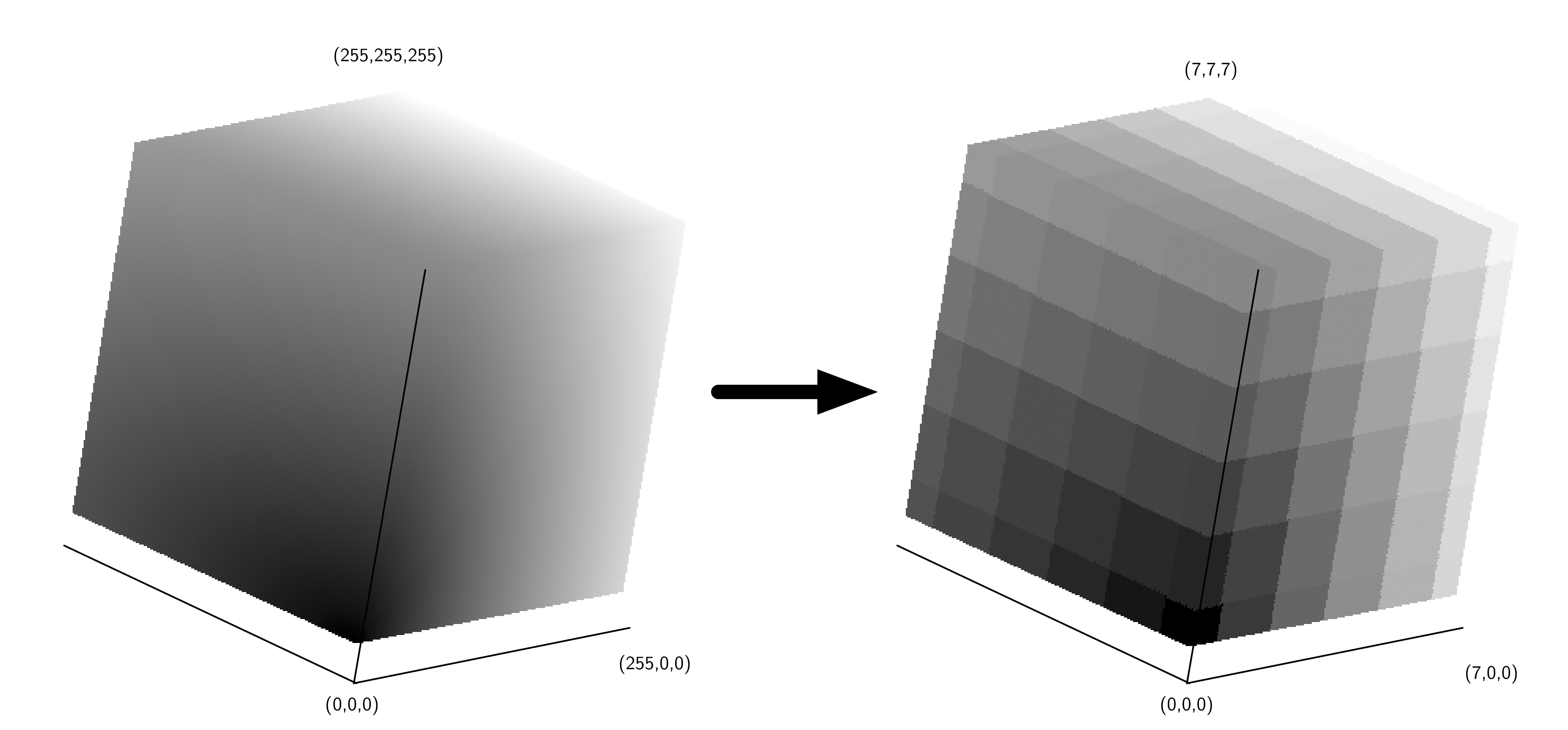 The simplest way to think about quantizing an image is to imagine taking the \(256 \times 256 \times 256\) cube and turning it into an \(8 \times 8 \times 8\) cube. The overall size of the cube stays the same, but now many colors in the old cube are represented by a single color in the new cube. Figureย 11.4.2 shows an example of the quantization just described.