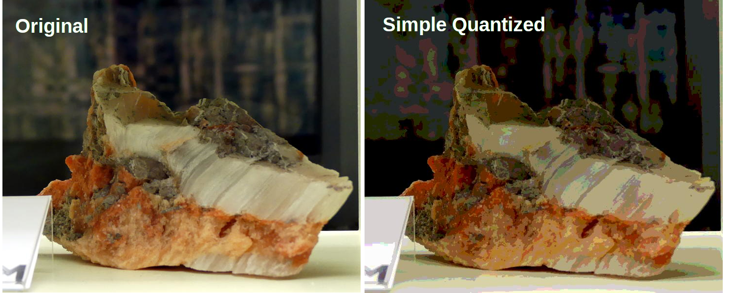 Figureย 11.4.5 shows a before and after comparison of original and quantized images of a crystal. You can use any JPEG color image from your collection and run the program to see the differences. Notice how much detail is lost in the quantized picture.