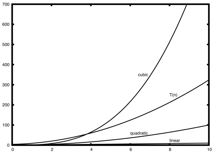 Figureย 2.3.4 shows a few of the common Big O functions as they compare with the \(T(n)\) function discussed above. Note that \(T(n)\) is initially larger than the cubic function. However, as n grows, the cubic function quickly overtakes \(T(n)\text{.}\) We can also see that \(T(n)\) then follows the quadratic function as \(n\) continues to grow.