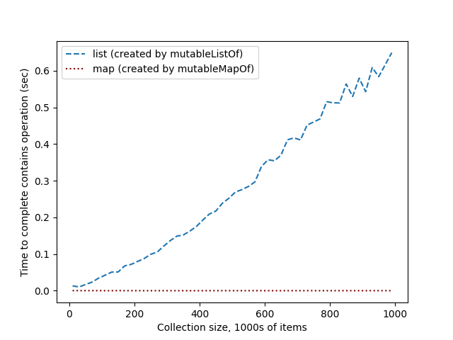 For our last performance experiment, we will compare the performance of the contains method for Kotlin lists and the containsKey operation for Kotlin maps. In the process we will confirm that the operation for lists is \(O(n)\) and the operation for maps is \(O(1)\text{.}\) The experiment we will use to compare the two is as follows: weโll make a list with a range of numbers in it, then we will pick numbers at random and check to see if the numbers are in the list. If our performance tables are correct, the bigger the list, the longer it should take to determine if any one number is contained in the list.