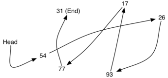 Note that since 31 is the first item added to the list, it will eventually be the last node on the linked list as every other item is added ahead of it. Also, since 54 is the last item added, it will become the data value in the first node of the linked list.