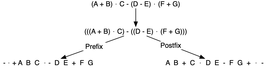 Here is a more complex expression: (A + B) · C - (D - E) · (F + G). Figure 3.9.6 shows the conversion to prefix and postfix notations.