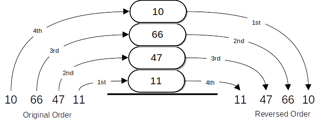 One of the most useful properties of stacks can be observed as items are added and then removed. Assume you start out with a clean desktop. Now place books one at a time on top of each other. You are constructing a stack. Consider what happens when you begin removing books. The order that they are removed is exactly the reverse of the order that they were placed. Stacks are fundamentally important, as they can be used to reverse the order of items. The order of insertion is the reverse of the order of removal. Figureย 3.3.3 shows the Kotlin stack of Ints as it was created and then again as items are removed. Note the order of the objects.
