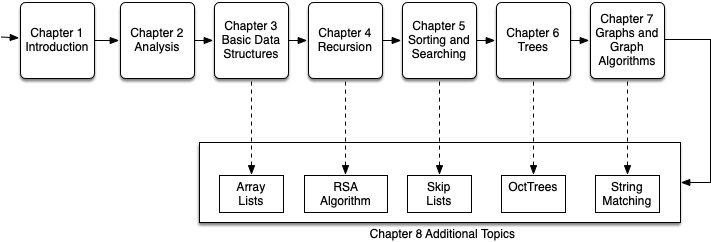 Chapters 3 through 7 provide a thorough mix of algorithms and data structures, often presented in context of a classic computer science problem. Although there is some latitude in terms of order, many of the topics have a sequential dependency and should be completed in the order provided. For example, in Chapter 3, we introduce stacks. We use stacks to explain recursion in Chapter 4 and then use recursion to implement binary search in Chapter 5.