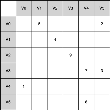 One of the easiest ways to implement a graph is to use a two-dimensional matrix. In this matrix implementation, each of the rows and columns represents a vertex in the graph. The value that is stored in the cell at the intersection of row \(v\) and column \(w\) indicates if there is an edge from vertex \(v\) to vertex \(w\text{.}\) When two vertices are connected by an edge, we say that they are adjacent. Figure 10.4.1 illustrates the adjacency matrix for the graph in Section 10.2. The value in each cell represents the weight of the edge from vertex \(v\) to vertex \(w\text{.}\)