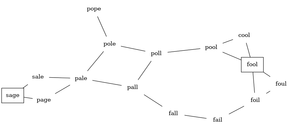 Our first problem is to figure out how to turn a large collection of words into a graph. What we would like is to have an edge from one word to another if the two words are only different by a single letter. If we can create such a graph, then any path from one word to another is a solution to the word ladder puzzle. Figure 10.8.1 shows a small graph of some words that solve the FOOL to SAGE word ladder problem. Notice that the graph is an undirected graph and that the edges are unweighted.