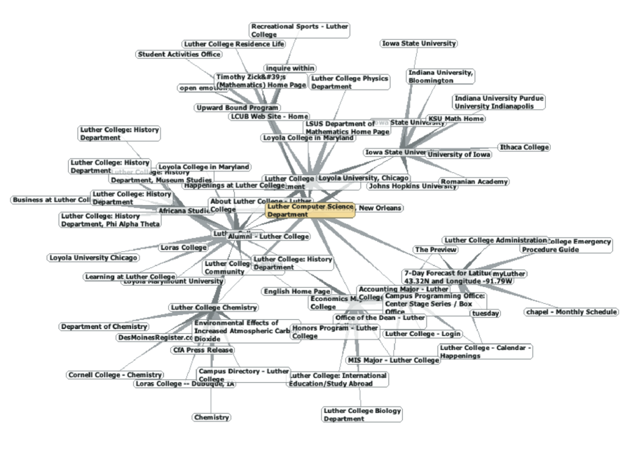 If you study the graph in Figure 10.18.1 you might make some interesting observations. First you might notice that many of the other websites on the graph are other Luther College websites. Second, you might notice that there are several links to other colleges in Iowa. Third, you might notice that there are several links to other liberal arts colleges. You might conclude from this that there is some underlying structure to the Web that clusters together websites that are similar on some level.