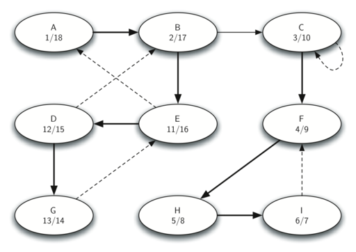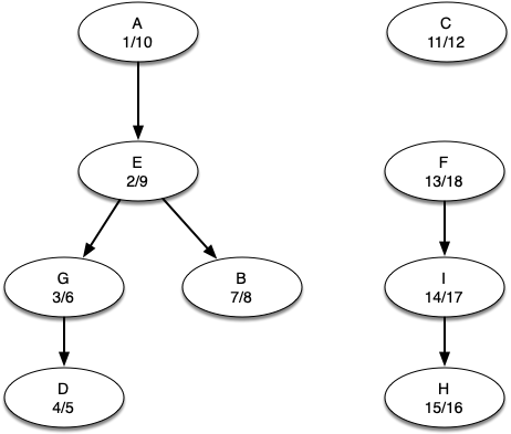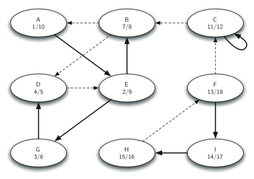 Let’s trace the operation of the steps described above on the example graph in Figure 10.18.2. Figure 10.18.6 shows the starting and closing times computed for the original graph by the DFS algorithm. Figure 10.18.7 shows the starting and closing times computed by running DFS on the transposed graph.