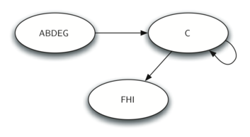 Once the strongly connected components have been identified, we can show a simplified view of the graph by combining all the vertices in one strongly connected component into a single larger vertex. The simplified version of the graph in Figure 10.18.2 is shown in Figure 10.18.3.