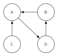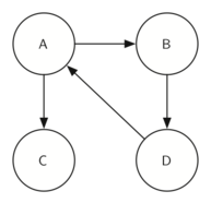 Once again we will see that we can create a very powerful and efficient algorithm by making use of a depth-first search. Before we tackle the main SCC algorithm we must look at one other definition. The transposition of a graph \(G\) is defined as the graph \(G^T\) where all the edges in the graph have been reversed. That is, if there is a directed edge from node A to node B in the original graph, then \(G^T\) will contain an edge from node B to node A. Figure 10.18.4 and Figure 10.18.5 show a simple graph and its transposition.