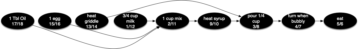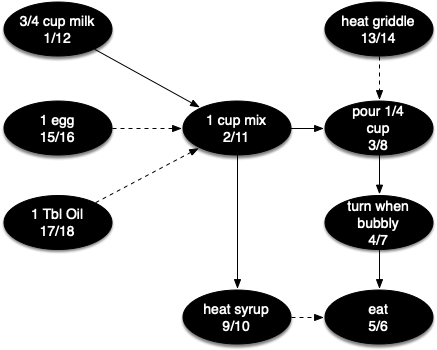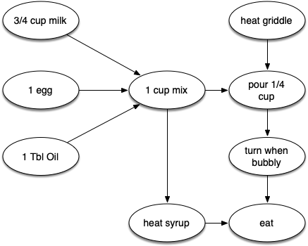 To demonstrate that computer scientists can turn just about anything into a graph problem, let’s consider the difficult problem of stirring up a batch of pancakes. The recipe is really quite simple: 1 egg, 1 cup of pancake mix, 1 tablespoon oil, and \(3 \over 4\) cup of milk. To make pancakes you must heat the griddle, mix all the ingredients together, and spoon the mix onto a hot griddle. When the pancakes start to bubble you turn them over and let them cook until they are golden brown on the bottom. Before you eat your pancakes you are going to want to heat up some syrup. Figure 10.17.1 illustrates this process as a dependency graph.