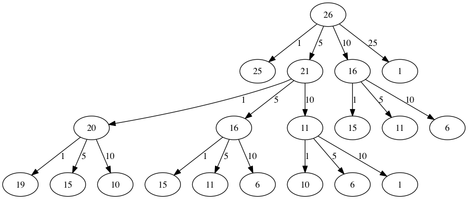 makeChange1. The label on the node indicates the amount of change for which we are computing the number of coins. The label on the arrow indicates the coin that we just used. By following the graph, we can see the combination of coins that got us to any point in the graph. The main problem is that we are redoing too many calculations. For example, the graph shows that the algorithm would recalculate the optimal number of coins to make change for 15 cents at least three times. Each of these computations to find the optimal number of coins for 15 cents itself takes 52 method calls. Clearly we are wasting a lot of time and effort recalculating old results.