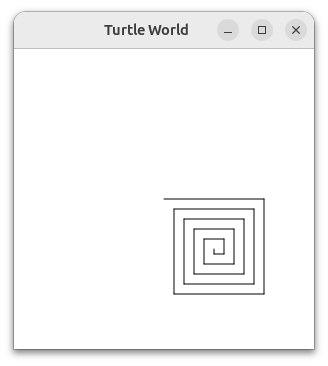 Here is an example to illustrate graphics basics. We will use the Turtle class to draw a spiral recursively. ListingΒ 4.7.1 shows how it is done. We first define the drawSpiral function. The base case for this simple function is when the length of the line we want to draw, as given by the lineLen parameter, is reduced to zero or less. If the length of the line is longer than zero, we instruct the turtle to go forward by lineLen units and then turn right 90 degrees. The recursive step is when we call drawSpiral again with a reduced length. In main, we create the turtle object, and then we call drawSpiral. We then hide the image of the turtle so we can see the drawing in its entirety, and then zoom in on the image so that we can see the entire picture without wasted space.