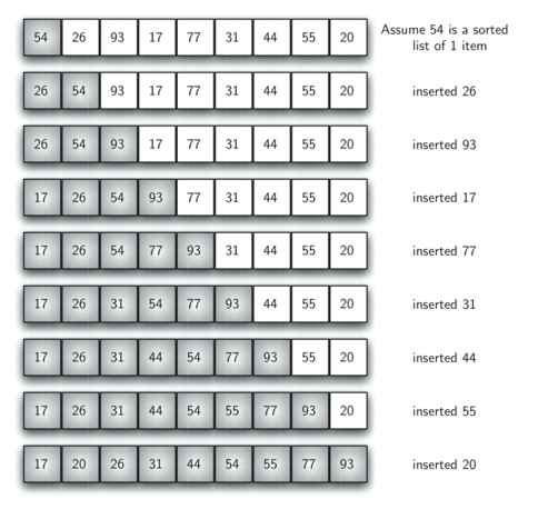 The insertion sort, although still \(O(n^{2})\text{,}\) works in a slightly different way. It always maintains a sorted sublist in the lower positions of the list. Each new item is then inserted back into the previous sublist such that the sorted sublist is one item larger. FigureΒ 5.8.1 shows the insertion sorting process. The shaded items represent the ordered sublists as the algorithm makes each pass.